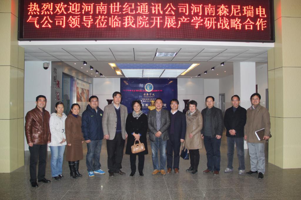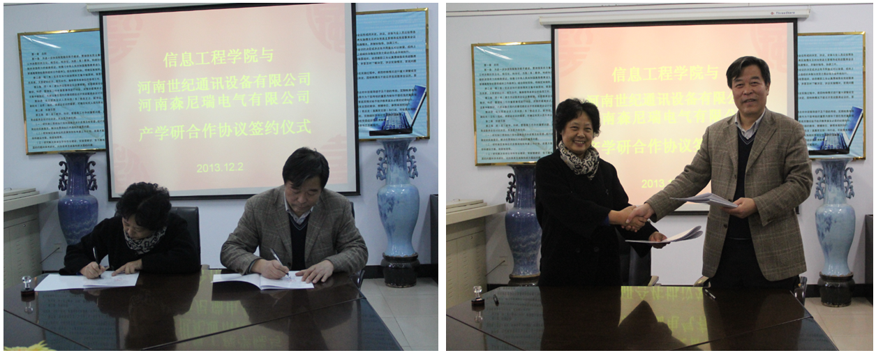 12月2日下午,Beat365官网与河南世纪通讯设备有限公司、河南森尼瑞电气有限公司进行产学研合作签字仪式在计科楼三楼会议室成功举行。院党总支书记郭超峰、院长张志立、副书记翟广辉、副院长冯战申等学院领导与河南世纪通讯设备有限公司副总经理郭林、河南森尼瑞电气有限公司总经理陈春华等企业代表参加了本次仪式。