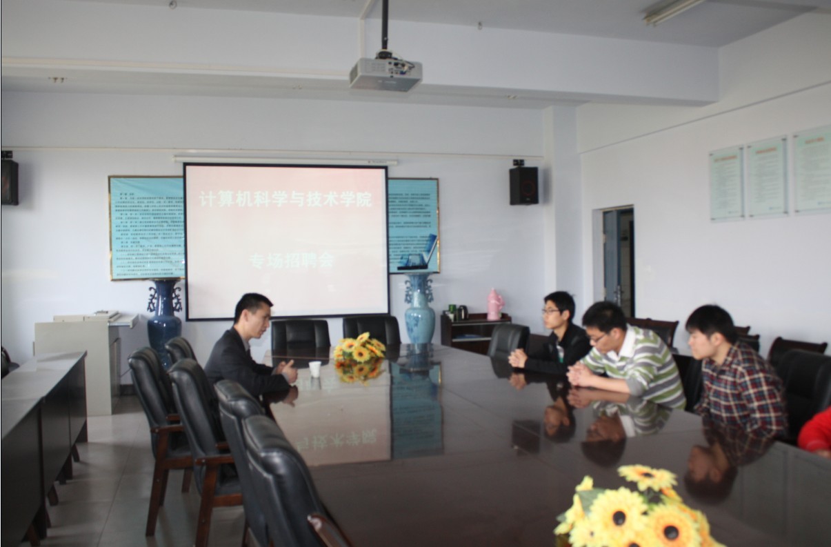 2013年4月12日下午2:00,计算机科学与技术学院在会议室315举办了毕业生专场招聘会。海通证券股份有限公司、上海众生网络科技公司等为计科09毕业生们提供了网络信息员、前台经理等共60多个岗位。