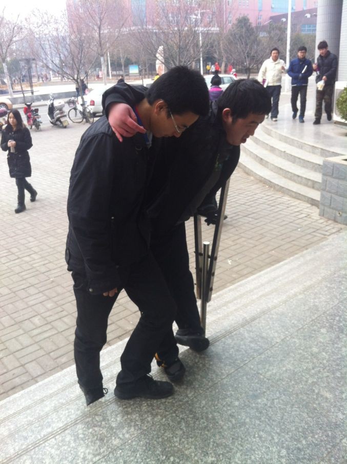 这位拄拐的同学叫豆华东,是计科院12级的学生,由于先天腿脚不便,出行困难。多年来,风雨如同一日,从小都是他家人背送他到班级。眼看豆华东渐渐成长,家人也渐渐衰老,于是学校发动广大师生来帮助他。每天安排同学接他进出宿舍和班级。