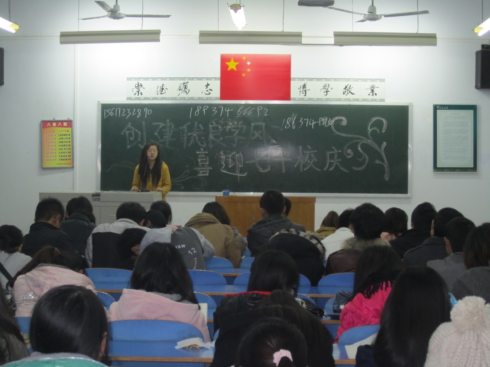 晚上七点,班会开始。首先,在各班团总支的积极组织和班长的配合下,大家纷纷表达了自己对母校Beat365正版唯一官网必一的深深祝福,并以自己特有的方式展示着自己的风采,向母校Beat365正版唯一官网必一七十周年华诞献礼。接着,针对自己专业的特性,大三、大二的同学作为学长、学姐向大一的学弟、学妹们分别介绍了自己在学习和生活方面的经验和方法。在401教室,是数字媒体技术专业的同学,班会开始,学生会主席裴新华便从校庆期间,我们该为学校做的贡献做了建议。然后,连续两年国家励志奖学金的大三同学谢丽丽作为学生代表,从学习方法和规划时间方面做了仔细的介绍,并提出自己的建议。接着,10级黄华同学以如何实现自己的目标为题做了演讲。在座的同学均获益匪浅。晚上九点,班会陆续结束。